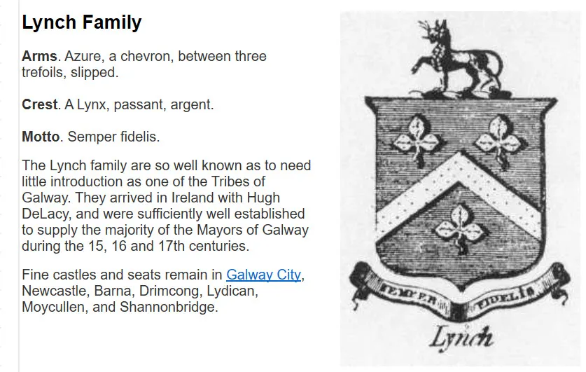 This is one of the most ancient, and, until the middle of the seventeenth century, was one of the leading families in Galway. In the old volume of pedigrees, preserved in the Heralds office, it appears, that, ”William le Petit, came to Ireland, in 1185, with Sir Hugh de Lacy, who granted him, by his charter, Macherithirnar, (now the barony of Macherydernan, in Westmeath,) except the Logh and Town of Dysart; that they were palatine barons of Molingare, and that William le Petit, had a son, Nicholas, who was ancestor to the family of Lynch of Galway.
