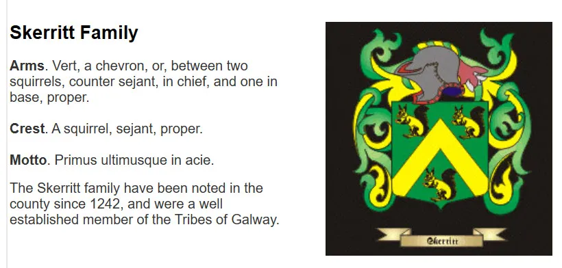 Francis SKERRET was born in 1650 in Killursa, County Galway, Ireland. He died on 3 Jul 1701 in Galway, Ireland. Francis married Anstace MARTIN. _ _****Anstace MARTIN was born in 1654 in Killursa, County Galway, Ireland. She died on 3 Jul 1707 in Galway, Ireland.
