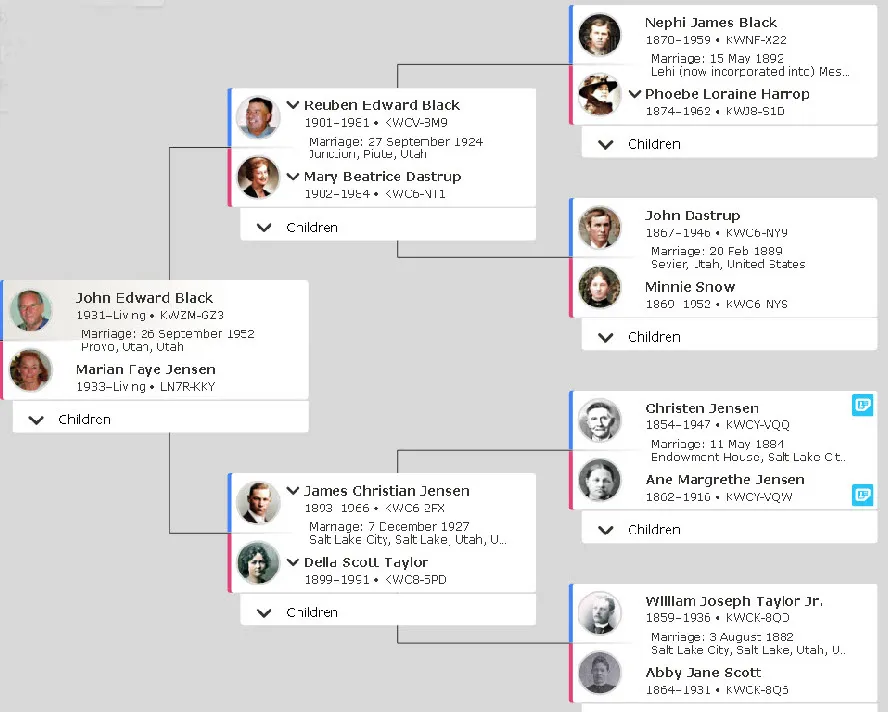 Reuben was born in Lehi (Mesa),Arizona. When he was a young man his family moved to Utah. His first job was going door to door selling Maytag washing machines. He later got a job with U.S. Gypsum in Sigurd, Utah. He started out by breaking gypsum rock with a sledge hammer and progressed to a truck driver. His next move was to observe and understand how to operate the heavy duty shovel used to dig gypsum. During this same time he and his wife, Beatrice,Dastrup Black took over operation of the Mercantile in Sigurd, Utah. Beatrice was the only clerk on the day shift and Reuben, in addition to his full time job, would take care of the store nights and weekends. When World War II broke out he left the gypsum plant and applied for a crane operator, and was accepted to work as an Operating Engineer building the Tooele Army Depot Base in Tooele, Utah. Once that job was over he went to Hanford Washington to build the nuclear production complex. Upon completion of the nuclear facility, he took a job as crane operator building the Geneva Steel plant Provo, Utah. Once the Geneva plant was finished he worked as a Operating Engineer doing projects assigned by the Union until he retired.