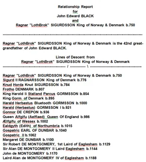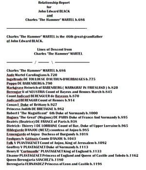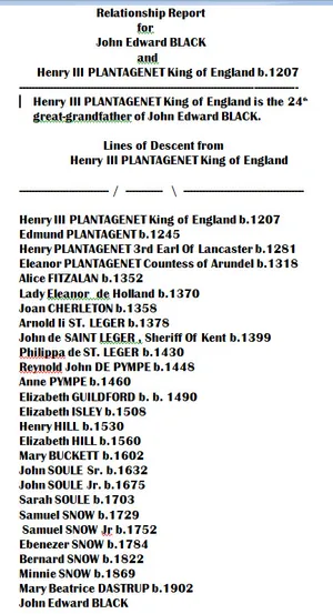 Ich bin ein Berliner John Edward Black Military Experience DUTKO - ROBERT I, "THE BRUCE," KING of SCOTLAND b 1277 Isabella of Mar Mary Beatrice Dastrup Mack Thomas Dastrup ANDREW HUNTER SCOTT B 1861 Sarah Ann Humphreys Roe b 1832 FMC Data Center, Pocatello, Idaho 1965 - ??? William Joseph Taylor ANE MARGRETHE JENSEN Christen Jensen b 1854 James Christian Jensen b 1893 John and Marian Jensen Black Immediate Family Robert FitzRoy, 1st Earl of Gloucester b 1090 William FITZROBERT 2nd Earl of Gloucester b.1110 Amice FITZWILLIAM 4th Countess of Gloucester b.1160 Countess Mathilde DE CLARE b1175 and Lord William DE BRAOSE b1175 Lord Richard John "Tadody" DE BRAOSE b 1197 and Lady Margred verch LLYWELYN b 1210 1st Baron William de Braose b 1222 and Giles (Braose) de Braose (aft. 1268 - bef. 1305) and Giles de Brewes/de Braose Lucy de Braose b1289 and Robert Maltravers b 1270 Sir John Maltravers b 1290 Sir John Gifford de MALTRAVERS VII b.1314 and Lady Baroness Gwenthlian WENTHLIAN b 1321 Margaret Kennedy b 1472 Marjorie DE BRUCE Princess of Scotland b. 1296 ROBERT STEWART II b 1316 King of Scotland ROBERT STEWART III, King of Scotland b 1337 and Anabella Drummond PRINCESS MARY STEWART of SCOTLAND b 1380 GILBERT KENNEDY b 1405 and Mary Stewart JOHN KENNEDY b 1454 and Elizabeth Montgomerie MARGARET KENNEDY b1472 JAMES STEWART, 1st Lord of Beath b 1506 JOHN STEWART, 4th Lord Innermeath JAMES STEWART B 1538 and Helen Ogilvy b MARGARET KENNEDY b1472 and Sir Andrew Stewart, 1st Lord Avandale GILBERT KENNEDY, 1st Lord Kennedy JOHN, 2nd LORD, KENNEDY b 1436 and Elizabeth Montgomerie b 1440 ROBERT I "The Bruce" King of Scotland b 1274 and Isabella of Mar b 1277 ALEXANDER de SETON i b 1288 and Christan de Cheyne b 1295 LADY MARGARET SETON b 1314 and Alan de Wyntoun b 1291 CHRISTINA SETON b 1340 and Sir George Dunbar, 11th Earl of Dunbar b 1370 LADY MARJORIE DUNBAR b 1389 and Alexander Lindsey, 2nd Earl of Crawford b 1387 DAVID LINDSAY, 3rd Earl of Crawford b 1405 and Marjory Ogilvy b 1406 ALEXANDER "The Tiger" LINDSAY b 1423 ALEXANDER LINDSAY b 1443and Isobel Campbell b 1448 MARGARET LINDSAY b 1464 and Lord Ogilvy of Arlie b 1473 LORD JAMES OGILVY B 1495 AND Lady Elinor Sinclair B 1495 James Steward, 5th Lord Innermeath and Helen Ogilvy b 1536 JAMES STEWART b 1565 and Catherine Fryer b 1567 JAMES STEWART b 1584 and Dorothy Dunlop b 1584 ROBERT STEWART b 1625 and Bethiah Rumball b 1641 ABIGAIL STEWART b 1664 and Richard Cosier b 1660 JOHN COSIER b 1693 and Susan Sara Marriott b 1715 ELIZABETH COZIER b 1767 and George Robinson b 1734 ESTHER ROBINSON B 1768 and John Weldon b 1766 Abby Jane Weldon b 1811 and George Humphreys Roe b SARAH ANN HUMPHREYS ROE b 1832 and Andrew Scott b 1815 ABBY JANE SCOTT b 1864 and William Joseph Taylor b 1859 DELLA SCOTT TAYLOR b 1899 and James Christian Jensen b 1893 TEST PHOTOS, ETC. Ragnar Lodbrok Sigurdsson b 767, King of Denmark & Sweden Crossing the Plains to Salt Lake City Growing up in Sigurd, Utah - Health Care 1900-1945 Bernard Snow 1822-1893 John Black Military Experience John Black b 1647 and Jane Eccles b 1653 My great, great, grandmother, Jane Johnston Black, was a servant to the Prophets. John Dastrup b 1867 and Minnie Snow Dastrup b 1869 Charles "The Hammer" Martel b 686 World War II Christmas Memories Alfred "The Great," King of England b 849 John Black Notes, Berlin, Germany, 1948-1952 Olof Skotkonung, King of Sweden, b 980 Harald I 'Bluetooth' Gornsson b 911, King of Denmark Harald I "fair Hair" Halfdansson, King of Norway Relationship Line To Ragnar Lothbrok Sigurdsson b 750 King of Denmark & Sweden Ragnar Lodbrok Sigurdsson b 1750, King of Denmark Dr. Thomas Ray Gledhill saved my life Ragnar Lodbrok Sigurdsson b 767, King of Denmark & Sweden Fifth Linear Black Family in Northern Ireland John Black Line to Robert I "The Bruce" King of Scotland John Black Line to Ancestors in Galway, Ireland ROBERT I "The Magnificent" b 1000 and Herleva Fulbert b 1003 Lineage - John Edward Black to William I “The Conqueror,” King of England John Black line to Charles Martel, Mayor of the Palace Lineage - John Black to Charlemagne, “Charles the Great” Lineage - John Edward Black to Alfred "The Great," King of England Lineage - John Edward Black to Henry III, King of England BEATRICE DASTRUP b 1902 Reuben Black b 1901 John Dastrup b 1867 MINNIE SNOW b 1869 BERNARD SNOW b 1822 and Sarah Gledhill b 1833 b 1833 EBENEZER SNOW b 1784 and Polly Hayes b 1788 SAMUEL SNOW JR b 1752 and Bettie Perkins b 1756 SAMUEL SNOW b 1729 and Deborah Tinkham b 1728 JONATHAN SNOW b 1703 and Sarah Soule b 1703 JOHN SOULE Jr b 1675 and Martha Tinkham b 1678 JOHN SOULE Jr. b 1675 and Martha Tinkham b 1678 EPHRAIM TINKHAM b 1649 and Esther Wright b 1649 Ephraim Tinkham b 1618 and MARY BROWNE b 1627 PETER BROWNE b 1594 and Martha b 1580 WILLIAM BOWNE b 1570 and Mrs. William Brown b 1561 Sir THOMAS BROWN b 1536 and Eleanore Harding b 1540 Sir HENRY BROWNE b 1502 and Katherine Shelley b 1511 Sir MATTHEW BROWNE b 1469 and Fredeswith Guildford b 1499 Sir GEORGE BROWNE b and Elizabeth Grey b Sir GEORGE BROWNE b 1438 and Elizabeth Grey b 1424 THOMAS BROWNE b 1402 and Eleanor FitzAlan b 1414 THOMAS FitzAlan b 1400 and Joan Moyns b 1402 JOHN FitzAlan b 1364 and Elizabeth Le Despence b 1367 JOHN FitzAlan b and Eleanor Maltravers b Sir Richard FItzAlan 10th Earl b 1306 and ELEANOR of LANCASTER PLANTAGENET b 1318 HENRY LANCASTER b 1281 and Maud de Chaworth b 1282 EDMUND PLANTAGENET b 1245 and Blanche of Artois Queen of Navarre b 1248 Temple and Family History Consultant/Helper John Black b 1717 and Jane Banks b 1728 John Black b 1754 John Black b 1681 and Margaret Gordon b 1692 Berlin Airlift Media First BLACK Families in Ireland John Black b 1558 and Elizabeth Bessie Locart b 1568 John Black b 1533 and Janet Cuik b 1643 JOHN BLACK b 1558 and Bessie Locort WILLIAM YOUNG BLACK (1784 - 1873) The History of the Scottish Clan Lamont John Black, b 1590, First Black into Ireland from Scotland WILLIAM BLACK b 1744 