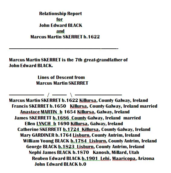 Francis SKERRET was born in 1650 in Killursa, County Galway, Ireland. He died on 3 Jul 1701 in Galway, Ireland. Francis married Anstace MARTIN. _ _****Anstace MARTIN was born in 1654 in Killursa, County Galway, Ireland. She died on 3 Jul 1707 in Galway, Ireland.